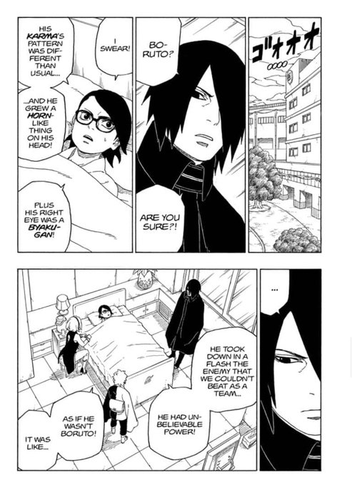 Chapter 44 - Amado. Is Momoshiki slowly turning Boruto to become his vessel. Sarada keeps watching over Boruto and repeating I want to help.